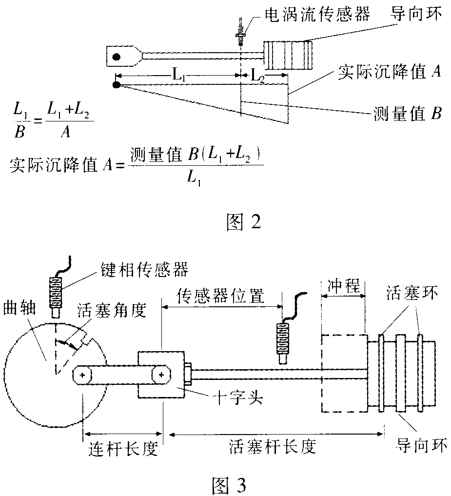 如圖2所示,由相似三角形原理可得出比例系數(shù)(L1+L2)/ L1,比例系數(shù)乘以傳感器間隙即為導(dǎo)向環(huán)的磨損情況,為此需將一些特定的機(jī)組參數(shù)輸入3300框架進(jìn)行計(jì)算,包括連桿長(zhǎng)度、活塞桿長(zhǎng)度、活塞沖程和傳感器的定位(如圖3所示)。
